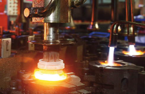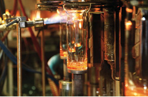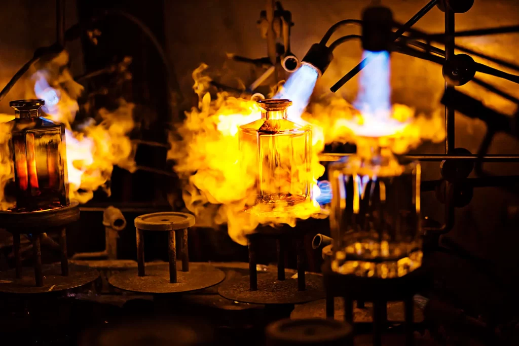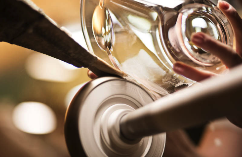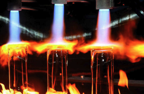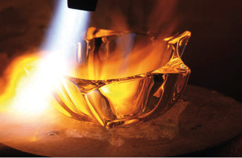 Glass is melted at the temperature of 1440 °C and then formed in cast-iron or steel moulds at the temperature of about 800 °C, using blowing or pressing. Before or just after taking out the pressing from the mould, its sharp edges are melted by flame of a gas burner. The product is then cooled a bit just at place to avoid its deformation. After a very short time, it is carried to a conveyor belt lehr and it is annealed gradually to avoid spontaneous cracking of glass. When annealed, it is necessary to remove useless parts, so called caps, from blown and also from some pressed semi-products. Using cracking-off machines, a sharp flame of gas burner is used for rotational shapes; for non-rotational pieces, removing is done by manual notching, using grinding wheels or diamonds. Afterwards, sharp and uneven rims are levelled by grinding, or by flame burning in case of stemware. Matt surfaces of the products that remain after grinding or burning-off are chemically polished using special polishing devices, where a mixture of sulphuric and hydrofluoric acids is applied.